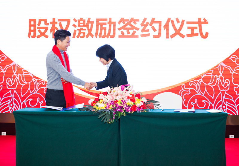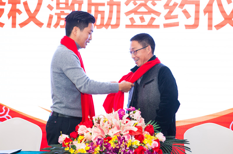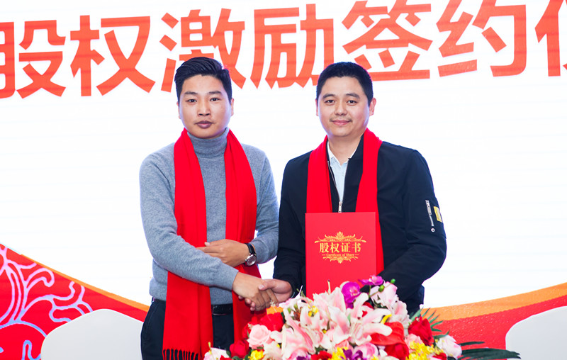 在股權激勵簽約儀式上,董事長分別與首次股權激勵對象——鴻宇建筑公司總經理李仕、行政部經理董玉梅、工程部經理馮廷俊、項目經理周裕祥、黃宗凱、采購部經理金如武、財務部李紅英簽訂《股權激勵分紅協議書》,并為他們佩戴榮譽哈達,頒發股權激勵證書,鴻宇全體家人向他們致以最熱烈的掌聲和祝賀。