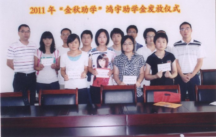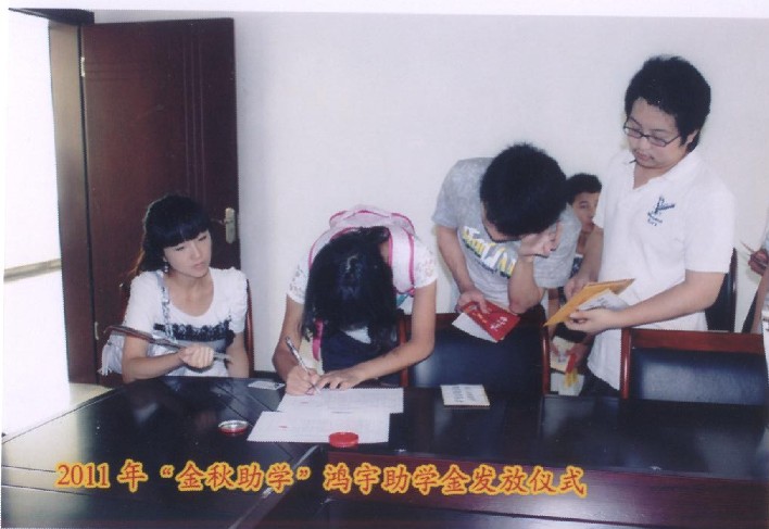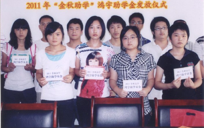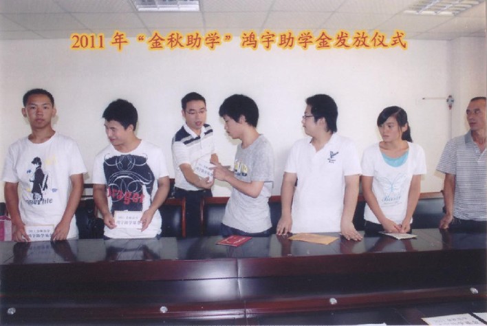 2011年金秋時節,鴻宇金秋助學基金由共青團鹽亭縣委發放到受助學子手中,用于幫助那些積極進取、家境清寒的青年有機會接受良好的教育,獲得更多的學習機會,幫助他們實現夢想。 鴻宇集團歷年來都會將旗下的鴻宇基金在適當的時候用于幫助那些需要幫助的人,我們秉承企業的宗旨“誠信、拓展、合作、奉獻”,在企業不斷成長的同時,我們心系著奉獻鴻宇的力量,回報家鄉的熱土,幫助求學的孩子,同時祝愿他們早日完成學業,成為一個對國家和社會有用的人!